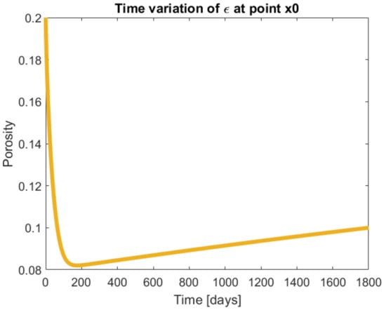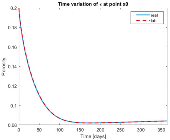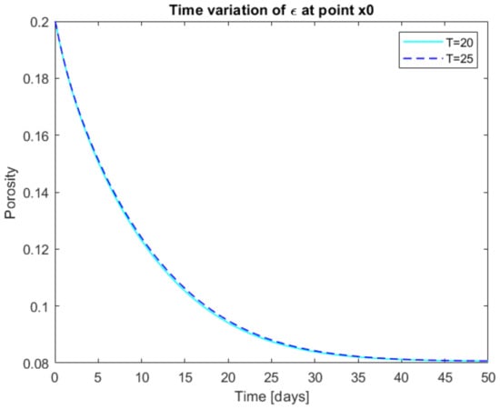 Profile of the porosity at point computed by the mathematical model (1) at time days for a concentration of carbon dioxide of 0.08% at a temperature of °C (cyan line) and at °C (blue dotted line).