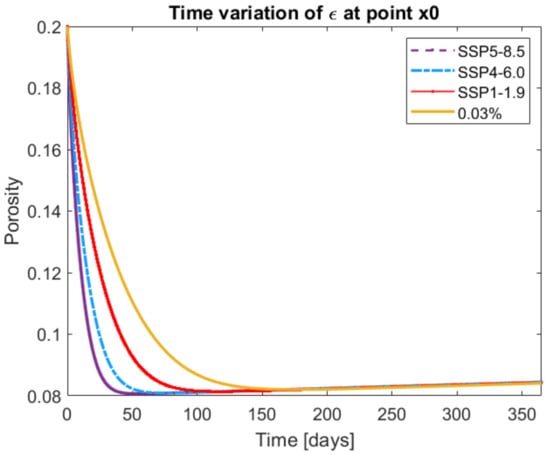 In the next Figure 12, where we depict the porosity profile after 50 days for levels corresponding to the SSP5-8.5 pollution scenario, we can observe that the profiles obtained at a temperature of °C (cyan line) and at 25 °C (blue dotted line) are nearly the same.