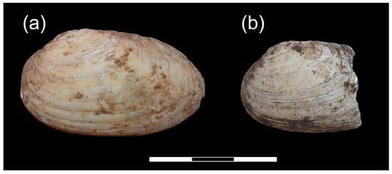 Mollusc shell remains discovered at the fortified settlement of Mineikiškės. (a) Thick-shelled river mussel (Unio crassus); (b) swollen river mussels (Unio tumidus) (photo by V. Micelicaitė).