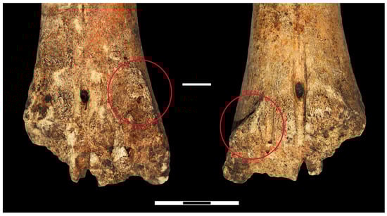 The age of cattle found in the settlements varies, and they appear to have been reared and kept both for meat production, secondary products, manure, and as draught power. Three individuals aged 2–3 years were found in both sites; it is likely that they were traditionally slaughtered at this age for meat. This practice is also prevalent in medieval societies when young cattle of 8–18 and 18–30 months of age were slaughtered [57,58,59]. A few skeletal remains of older adult individuals of 5–6 and 8–9 years old were also found in Garniai 1 and Mineikiškės. It is more likely that older animals were used for dairy products and work. The indication that cattle from Mineikiškės could be used as draught animals is the metacarpal bone with exostoses on the distal part (Figure 3). This type of pathology often occurs when the animal is exposed to heavy loads [60,61]. However, exostoses on the lower limb of cattle can occur not only as a result of high stress during work but also due to the age of the animal, soil characteristics, genetics, and other reasons [60]. The demand for dairy products in the community would be indicated by the increased number of bones of older females [62]; however, due to the fragmented zooarchaeological material in these settlements, it is hardly possible to observe such trends at present.