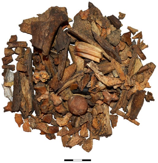 In Mineikiškės, 40 m2 was investigated in the southern part of the settlement during 2017 and 2020 [13,14]. The assemblage consists of 99 artefact fragments made of antler, bone, ceramics, bronze, flint, and stone, supplemented by 5889 pottery fragments and 7948 specimens of animal skeletal remains (2711 pieces in 2017 and 5237 in 2020). Bones of horse and large bovid, charred organic residues in pottery, grains of Hordeum vulgare and Cerealia, and wood charcoal (altogether 19 finds) were AMS-dated to the period from 983 to 388 cal BC [22,23,24,25,26].
