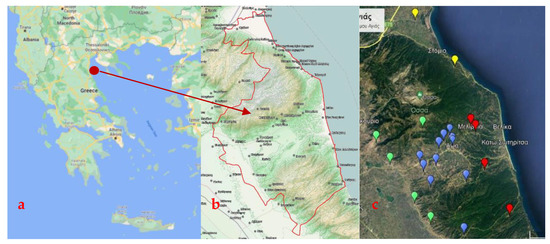 Geographic location and distribution of the school buildings (google maps). (a,b) Location of the Municipality of Agia in central Greece. (c) Distribution of the stone school buildings in the Municipality of Agia. The colors of the map represent the stone schools found in the four units of the Municipality (green: unit of Lakeria blue: unit of Agia, red: unit of Melivia, yellow: unit of Evrimenes).