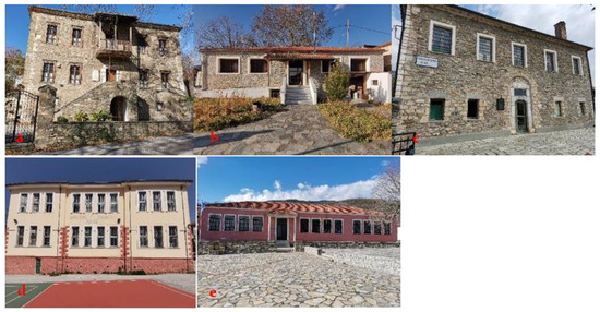 Historic school buildings concern a significant part of European built heritage, presenting multiple similarities and depicting both the tangible and intangible diachronic principles of education and evolution. They were erected during the end of the 19th–beginning of the 20th century and were equally distributed in urban and rural areas, including remote and difficult-to-be-approached places [1,2,3,4]. Their evolution was closely related to the wider historic and socio-economic aspects of each region, while their construction followed traditional building materials and techniques [1,2,5,6,7,8]. While they depicted the educational principles of each era, they were usually found as cultural landmarks of the settlements.