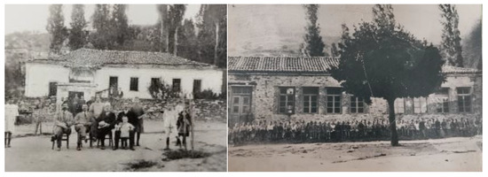 According to testimonies from the citizens of the settlement, a school was already running in the settlement Megalovrysso from the beginning of the 18th century, in the Monastery of Panagia; in 1881–1882 a new building was erected in the center of the village, hosting 40 students (Figure 4). It consisted of two classrooms, the director’s and teachers’ office, and a store house. In the beginning of the 20th century, it was demolished and was replaced with the studied building in 1931. The motives for the substitution of the school are unknow; however, these could be linked to severe damages to the old building or enlargement of the educational needs (increase of students’ number).