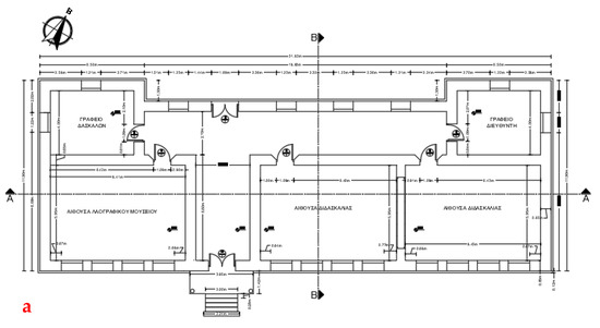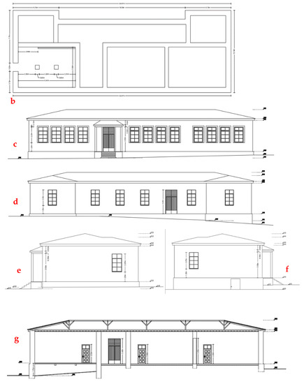 According to the survey and as depicted in the architectural plans (Figure 6), the building was elevated around 0.5–0.9 m from the ground and had an inner height of 4.3 m. The classrooms’ dimensions were 6 × 8.4 m, while the openings (1.2 × 2.2 m) were successively placed every 0.3 m (Figure 7). In the main façade, there was a perimetric frame made from mortar (Figure 7c). The walls, made of stone masonry, had a thickness of 0.65 m and were rendered both in the internal and external. The roof was wooden, covered with ceramic tiles. It is, therefore, concluded that the construction of the building followed in detail the earlier standards of construction (1881, 1894).