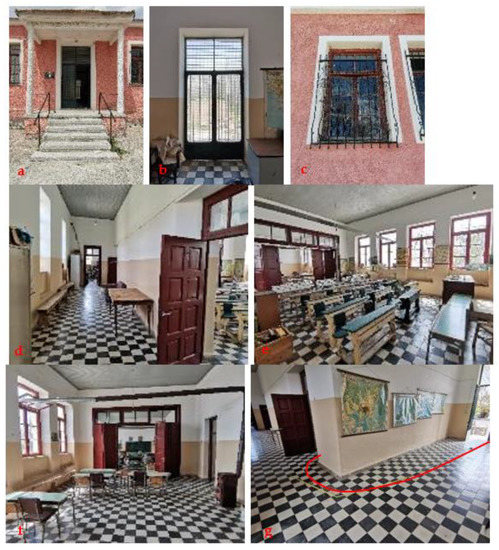 Figures from the external and internal of the school building. (a,b) the main entrance from the external and internal, (c) openings from the external, (d) the elongated corridor leading to the director office, (e,f) the eastern classrooms divided with the wooden frame, (g) the cross section of the transverse and elongate corridors, depicting the students’ route to the main classroom.
