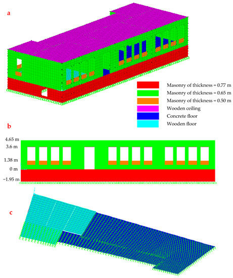 The primary steps of any structural assessment studies refer to the investigation and documentation of the existing structure in extent and in depth as well, in order to ensure the reliability of the data on which any further analysis will be based. Therefore, the following tasks must be accomplished: (i) detailed architectural drawings; (ii) description of the building’s history and possible previous interventions; (iii) investigation of interconnections between walls; (iv) detailed description of the structural bearing system; (v) description of the present state including pathology issues; (vi) conduction of in situ and laboratory experiments in order to determine type/strength of materials, etc.; and (vii) investigation of foundation and subsoil type [26,40]. Referring to the present study, taking into account the limited financial and technical means available at the present state, the structural assessment is restricted in the detection of the most vulnerable areas of the masonry building under persistent and seismic loading conditions. In addition to the aforementioned, it is recommended that a preliminary structural analysis be conducted in order to: (i) detect the most vulnerable zones; and (ii) define the possible failure modes [40]. The results will enable the design of a targeted program of investigational surveys.