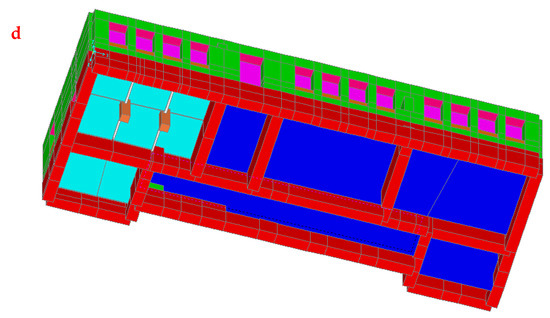 Characteristic captions of the finite element model. (a) 3D view, (b) front view with openings, (c) vertical springs (green) in rise view of wooden (light blue) and concrete plates (dark blue), (d) masonry pillars at the basement in rise view.