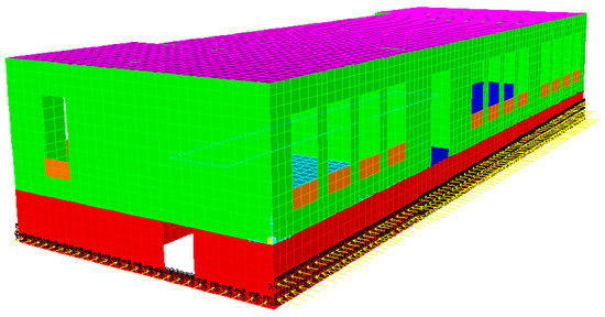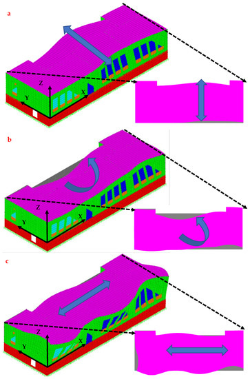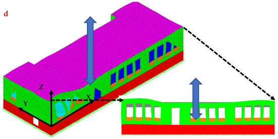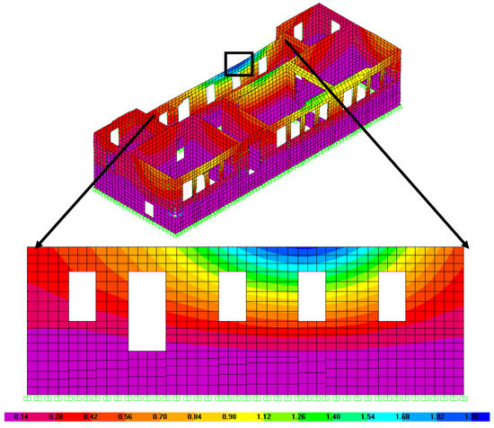 Figure 14 depicts the deformed shape of the building in terms of resultant displacements according to G + 0.6 Q EX EY EZ loading combination. The maximum resultant displacement received a value of 1.728 mm and corresponded to an elongated masonry wall, which belongs to the perimeter of the building. In particular, it comprised the following maximum values along the X, Y and Z axis, respectively: 0.502 mm; 1.724 mm; 0.203 mm. Therefore, the contribution of translation along the Y axis was considered to be the critical one.