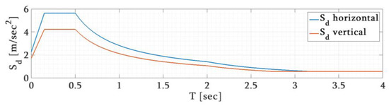 The seismic action was based on EN 1998 [56] and the Greek National Annex to EN 1998 [57]. Figure 11 depicts the design spectrums along the horizontal and the vertical directions. The ground type corresponds to B and therefore, S = 1.2 for horizontal action and S = 1 for vertical action, TB = 0.15 s, TC = 0.5 s, TD = 2 s. The horizontal design acceleration of type A ground was equal to = 0.24 g for the horizontal action and = 0.216 g for the vertical action. The lower bound factor for the design spectrum received the value of = 0.2 and the behavior factor received the value of = 1.5.