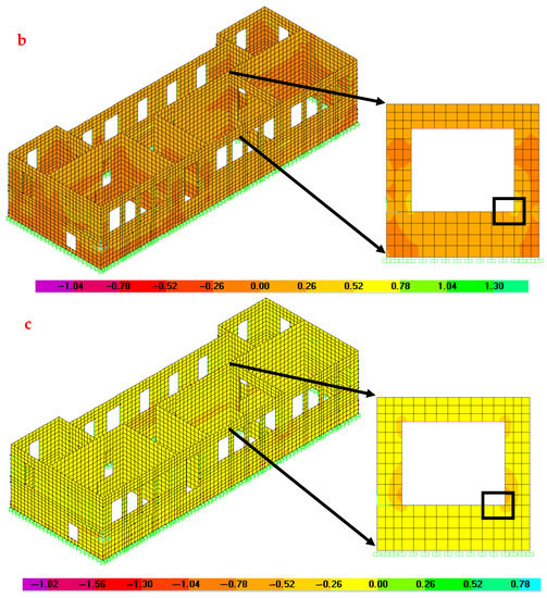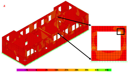The structural assessment, in terms of detection of the most vulnerable zones, under dynamic or seismic loading conditions, refers to response spectrum analyses, which included the following combinations: (i) G + 0.6 Q EX EY; (ii) G + 0.6 Q EX EY EZ, where E is the translational seismic action along X, Y and Z axis [72]. The second loading combination takes into account the action of the vertical ground component and corresponds to the maximum values of developed stresses. In particular, the maximum compressive stress received a value of −515.606 kPa; the maximum shear stress received a value of 224.72 kPa; and the maximum tensile stress received a value of 386.584 kPa. However, all the aforementioned critical stresses were observed at the corners of an internal masonry, where discontinuities were expected. Furthermore, in a future, more advanced model, the aforementioned area, as well as all areas prone to stress concentrations, must receive a mesh refinement. Figure 13 depicts the developed stressed at the masonry structures of the building and at the aforementioned internal masonry.