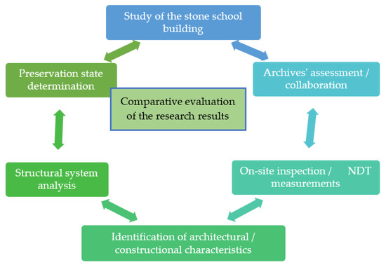 The scope of the study was to identify the characteristics of the historic schools of this specific region, comparatively assess their differences and similarities, and envisage the key elements of their structure and performance. It emerged from the gap shown in the relevant literature [1,4,6,10,11,12,14,15], mainly focusing on the structural and energy integration of this significant part of common European built heritage that still maintains its initial functional role as educational centers. Due to the intense need for structural integrity and energy performance in the running of historic schools nowadays, it is considered a mayor task to highlight the diachronic principles governing their construction in order to avoid improper repair works. This is also important in cases of schools’ de-characterization and abandonment, so as to preserve them for future generations. The innovation of the study is based on its multi-disciplinary approach, assessing valuable data from the historic, geographical, architectural, constructional and structural characteristics of this category of heritage structures.
