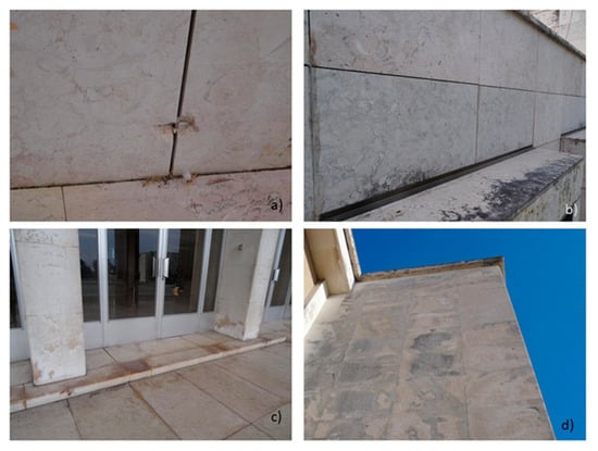 Examples of natural stone facade reactions to environmental conditions: (a) anchor rupture leading to strength loss; (b) biocolonization showing a relevant colour change; (c) white stains from saline efflorescence; (d) dark stains from water absorption, which might lead to slab detachment (photo credits: Vera Pires).