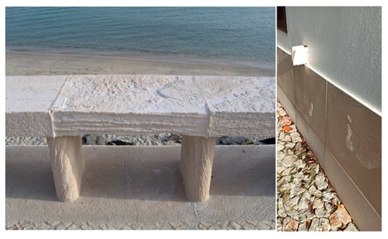 Natural stone facades located near coastal areas usually start by showing surface alterations in colour and gloss and then evolve to changes in the stones’ physical–mechanical properties as salt action goes on [12,16]. Besides salt fog, pollution and moisture rising up through the building’s foundations are also identified as possible salt causes [18].