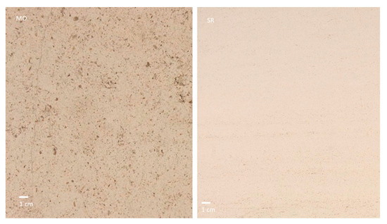 Macroscopic aspect example of the selected limestones: MO and SR with a honed finish.