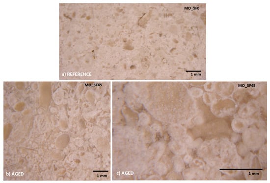 Microscopic analysis of MO limestone before and after 45 salt fog cycles: (a) Reference MO limestone; (b) and (c) examples of salt-aged MO_SF45 specimen showing oolites individualization.