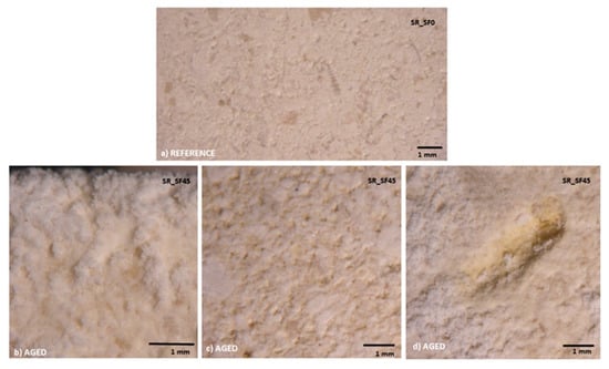 Microscopic analysis of SR limestone before and after 45 salt fog cycles: (a) Reference MO limestone before salt fog cycles (MO_SF0); (b) and (c), examples of salt-aged SR_SF45 specimen showing a continuous salt layer at the surface; (d) Example of bioclast removal in an aged specimen.