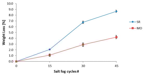 Average weight loss (%) evolution assessment of the studied limestones: MO and SR. For this assessment, 10 specimens were considered per lithotype.
