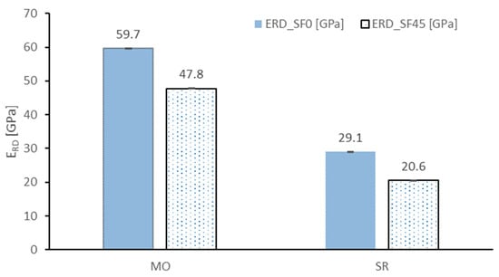 In the present study, the ERD average values, depicted in Figure 7, show an average drop of 29% comparative to reference values for SR (altered from 59.7 ± 0.01 GPa to 47.8 ± 0.02 GPa). The MO elastic modulus decay was lower, showing an average drop of 20% (altered from 29.1 ± 0.03 to 20.6 ± 0.05 GPa) (Figure 7).