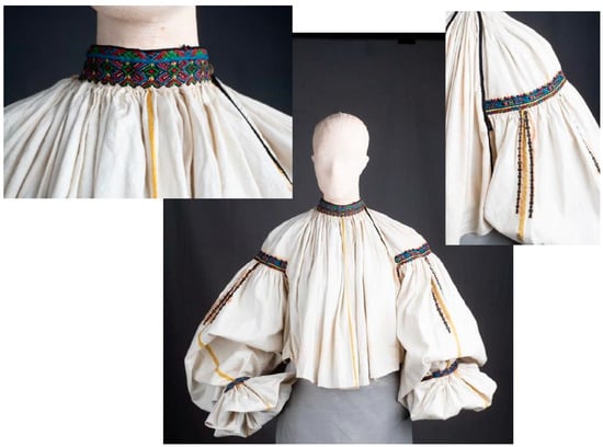 The shirt is the most significant part of the Romanian traditional costume and therefore receives particular attention, reflected in cut, decoration, chromatics, materials and techniques [1]. On special occasions, it acquires even a stronger symbolic significance, becoming a vestmental code to express provenience, appurtenance to age and ethnic groups, or civil status [1,2]. At the end of the 19th century, this traditional shirt elegance attracted the attention of the Romanian Queen Elizabeth (1843–1916), who started to wear shirts at Court events and international meetings. Her aim was to evidence that Romanian spirituality has deep roots in the history of the nation and that it is also witnessed the refinement and artistic diversity of traditional clothing. Noblewomen followed the Queen’s model in her effort to promote the traditional costume, while later on Queen Mary of Romania (1875–1938) and her daughters also became ambassadors of the traditional costume [3]. Nowadays, traditional shirts dating back to the 19th and 20th centuries are preserved in museum collections, as material testimonies of the peasants’ skillfulness and artistic taste. An increasing interest in their examination has materialized in recent years in several studies and exhibitions [1,2]. Moreover, the traditional shirt with decoration over the shoulder, the so called “ia cu altiță”—still widespread nowadays on both sides of the Carpathian mountains—was recently accepted as part of the UNESCO National Inventory of Active Intangible Cultural Heritage Elements [2]. Since 2012, the concern to conserve the traditional shirt as an element of cultural identity was also reflected in the spontaneous organisation of several sewing groups, in different areas of Romania, who produce their own shirts by following models of traditional items. In order to reproduce them as faithfully as possible, special attention is given to the materials—textile fabrics, sewing and decoration yarns, as well as to the dyes used.