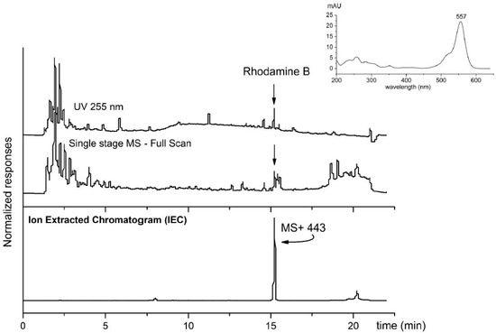 Rhodamine B (1887), which belongs to the class of xanthene, is detected based on information available in the literature and confirmed by examination of the standard dyed wool samples, λmax = 558 nm and MS+ 443 (Figure 2). These characteristic features were observed in one violet wool and two pink silk samples, as individual dye, and in a red silk sample together with a red dye, which did not match any of the dyes in the existing database but presents UV-Vis data related to safranin T. Unfortunately, no mass spectrometric data was available for the respective sample. Rhodamine B was also identified in Saxon sheepskin coats’ silk decoration, dated between 1900 and 1908, in a previous study [38].