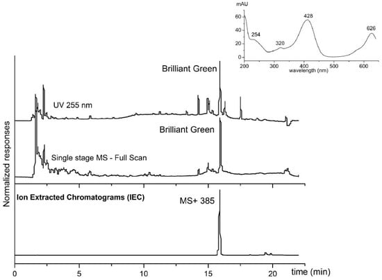 Apart from the three cases mentioned above, where dyer’s broom with a copper mordant or with indigo based dyes were used, synthetic dyes were responsible for the colour. Picric acid (1771), obtained by nitration of phenol and considered one of the first semi-synthetic dyes, was identified in a silk sample which presents a green-yellow hue in a shirt dated 1885 (inv. 3816). As for the other synthetic dyes, detection was based on the UV-Vis spectra (λmax = 360 nm) correlated with retention, according to information acquired by examination of standards. Picric acid was previously identified in a silk sample from a flag used at a celebration in 1871 [50,51]. Brilliant green (1879), a representative of the triarylmethane group, was detected in two samples, on wool and on silk respectively, based on UV-Vis and mass spectrometric data (λmax = 428, 626 nm and M+ 385), associated with retention (Figure 3). According to previous studies, brilliant green was enthusiastically adopted, as proved by its identification in shirts and sheepskin coats from the end of the 19th and beginning of the 20th century [38].