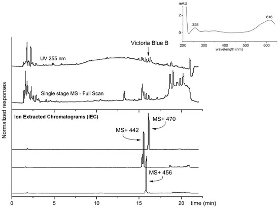 Synthetic dyes from the triarylmethane group were used in almost half of the total number of samples to achieve a blue hue (5/12), in all but one being used on silk. Victoria Blue B (1883) was responsible for the colour in almost all cases (four/five), on wool and silk while alkali blue (1864) in the remaining silk item. Identification of Victoria Blue B was made based on the UV-Vis and MS data, λmax = 604 nm (MS+ 456), λmax = 616 nm (MS+ 470), correlated with retention, for the chromophores mentioned in the literature (Figure 4) [26]. This dye was also detected on rayon, in the decoration of a Saxon accessory, dated 1935 [36]. The other triarylmethane dye detected, alkali blue, was revealed according to the UV-Vis data, λmax = 596 nm, correlated with retention, as resulted from the analysis of reference dyes in the Schweppe collection.