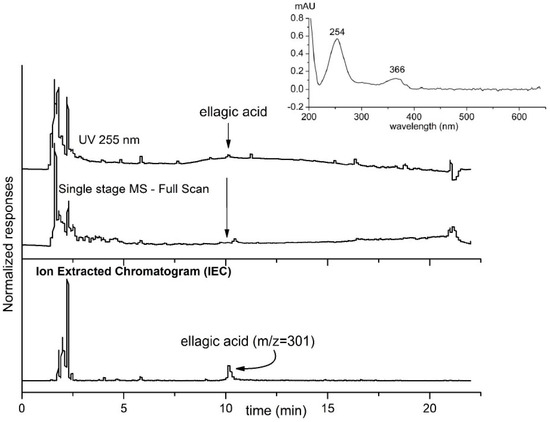 Ellagic acid was identified in the two brown silk samples available for analysis, which suggests the use of tannins. Detection of ellagic acid was based on the UV-Vis and mass spectrometric data, λmax = 254, 366 nm, MS− 301. Iron was also present in these samples as revealed by XRF (Figure 5), which is in perfect correlation with the literature which mentions the use of iron salts and tannin-containing plants to dye brown and black. Tannins are polyphenols of vegetal origin, galls on Quercus species, Alnus barks and Cotinus coggygria leaves being among the most popular sources. Recipes to describe the use of tannin sources and iron represent 80% of the formulae for dyeing black and brown in a collection of dyeing recipes edited by the Romanian Academy in 1914 [10]. Alnus bark and green walnut husks and leaves are the most frequent tannin sources used.