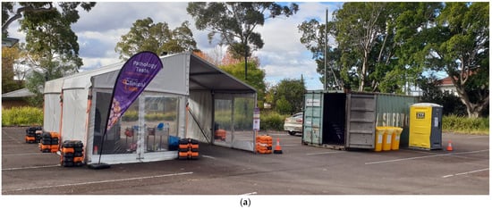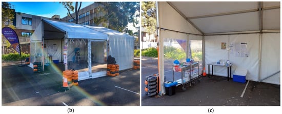 Emergent, yet ephemeral heritage places. COVID-19 testing station at Hornsby, NSW. (a) general view of layout with testing bay, storage container, toilet and waste facility; (b) testing bay showing temporary construction; (c) interior of testing bay (Photo Dirk HR Spennemann, June 2021), [].