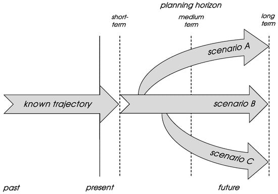 Standard forecasting based on strategic foresight considers the trajectories of present day social, economic and environmental trends, and merges these with emergent and on-the-horizon technologies and opportunities. Based on these, several scenarios are developed as to what a future would look like in the medium (5–10 years) and long term (more than 10 years) (Figure 5) [,,]. As time moves on, the assumptions that underpinned some scenarios did not eventuate, causing these scenarios to become obsolete, while other scenarios may remain valid forecasts.