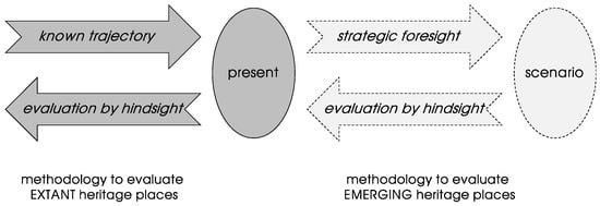 A viable heritage futures paradigm, as initially articulated in a 2012 conference presentation [], draws on these plans and places the heritage professional of today into that envisioned future—with the assumption that the strategic foresight scenario has proven to be correct. In this paradigm, we are now writing the year of the defined planning horizon (say, 2045) and the community we are ‘living’ in, that is, the social and physical environment we are experiencing in 2045 is as exactly as it was envisioned ‘back in 2022’. This hypothetical heritage professional can now employ the standard tools of hindsight to look back to and evaluate the heritage of the early 2000s. Standard methodology can be used to assess which heritage places would have sufficient significance for the realities of 2045, and then allow them to be listed and protected (Figure 6).
