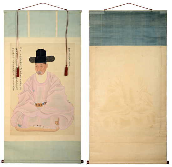 Image of the recto and verso of hanging scroll 1996,0329,0.1 (P1), showing the portrait of Chae Je-gong (1720–1799 CE). Dimensions are 142.0 × 75.5 cm with mount and 96.5 × 59.5 cm without. Date is 1789 CE. © The Trustees of The British Museum.