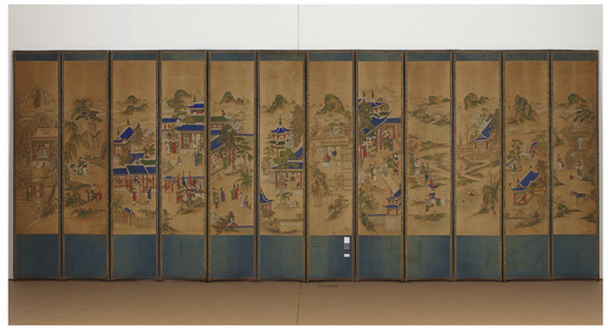 Seen below is a late 19th-century twelve-panel screen silk painting representing scenes of stories visualising the five Confucian virtues, which are about relationships between the king and his servants, father and sons, husbands and wives, the elders and the young and between friends (Figure 3) [37]. This painting is a rare example in terms of its size and highly decorative presentation.