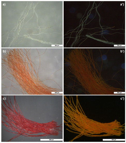 Microscopic images of the samples taken from P1 under visible (a–c) and UV (a’–c’) light. (a,a’) light blue sample from textile border; (b,b’) red/orange sample from tassel; (c,c’) bright red sample from hanging rod.