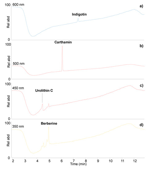 DAD chromatograms obtained by HPLC-DAD-MS/MS analysis of (a) light blue sample; (b) bright red sample from the hanging rod; (c,d) dark red/orange sample from tassel of P1.