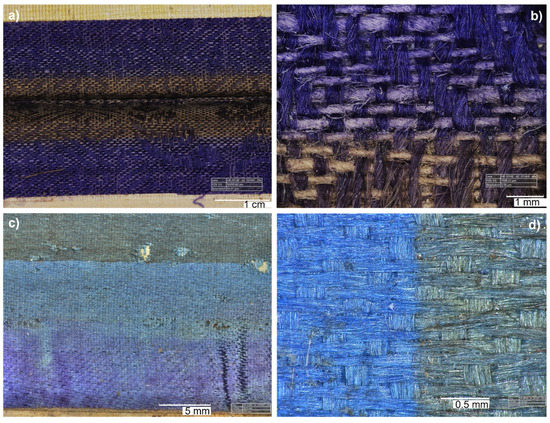 Images of the purple (a,b) and blue (c,d) textile borders of P2 obtained by digital microscopy, highlighting the discolouration of the exposed areas and the vibrant colours of the protected areas.