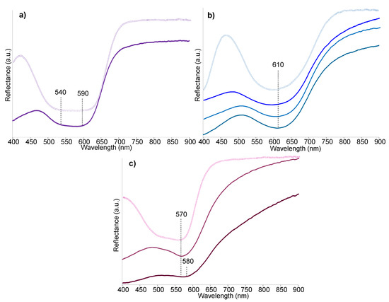 Reflectance spectra obtained by FORS analysis of P2 corresponding to (a) purple textile (full line) and reference sample of methyl violet (hollow line); (b) blue textile (full lines for the three areas visible in Figure 6c) and a reference sample of methyl blue (hollow line); (c) brown textile (full line, bottom), pink textile (full line, middle) and a reference sample of fuchsin (hollow line).