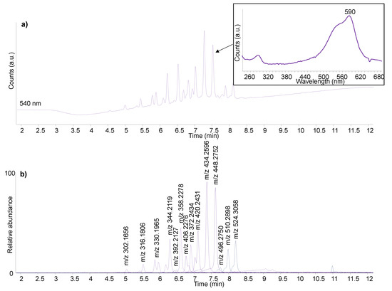DAD (a) and positive ionisation extracted ion (b) chromatograms obtained by HPLC-DAD-MS/MS analysis of the pink sample from P2. The experimental masses of the molecular ions [M]+ are reported.