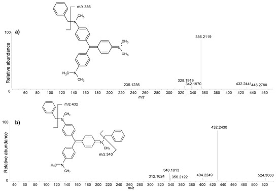 The HPLC analysis of the purple sample produced a complex chromatographic profile, as shown in Figure 8. The molecules ranging from m/z 302.1656 to m/z 372.2434 were identified as the homologue series of N-methylated pararosanilines containing from one to six N-methyl groups. These are the main components of methyl violet (C.I. 42535) according to the literature [50] and are in agreement with the in-house analysis of the reference samples. However, two additional homologue series were detected. The former one included molecules with molecular ions [M]+ = m/z 406.2278 (two isomers), 420.2434 (two isomers), 434.2591 and 448.2747. The latter one included molecules with [M]+ = m/z 496.2724, 510.2904 and 524.3060. Tandem mass spectra (MS/MS) were acquired for these molecules in order to elucidate their molecular structures. The MS/MS spectra for the molecules with [M]+ = m/z 448.2747 and 524.3060 are reported in Figure 9. The main fragmentation patterns revealed the neutral loss of C7H8 (92.0626 u) fragments corresponding to benzyl groups. The molecular structures were therefore assigned to N-benzyl and N-N-dibenzyl derivatives of N-methylated pararosanilines with different degrees of methylation. These compounds are reported as synthesis products associated with the production of methyl violet formulations [51,52]. In particular, methyl violet 6B is described as N-pentamethyl,N-benzylpararosaniline chloride produced by the action of benzyl chloride on ordinary methyl violet [51]. Furthermore, methyl violet 3B, 4B and 5B are described as mixtures of ordinary methyl violet and methyl violet 6B [51]. The reference samples of methyl violet 3B were available, and the results obtained from these samples indeed showed all the compounds detected in the purple sample from P2 (Figure S5a—Supplementary Material). These benzylated methyl violet formulations are given C.I. number 42536 and started to be produced after 1866 [52].