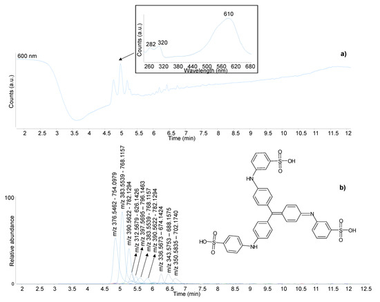 DAD (a) and negative ionisation extracted ion (b) chromatograms obtained by HPLC-DAD-MS/MS analysis of the blue sample from P2. The insert reports the UV-Vis spectrum of one of the molecular components. The experimental masses of the pseudomolecular ions are reported as pairs of doubly charged [M-2H]2− and single charged [M-H]− ions. The molecular structure of methyl blue ([M-2H]2− = m/z 376.5460 and [M-H]− = m/z 754.0993) is included.