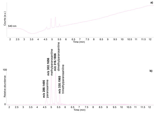 The HPLC analysis of the pink sample showed the presence of four molecules, which corresponded to the main components of fuchsin (C.I. 42510), i.e., pararosaniline and its methylated, dimethylated and trimethylated derivatives (Figure 11) [25,50]. This dye is also referred to as magenta, and in the early synthetic process, the molecules were obtained by heating an oxidant with a coal tar distillate (or aniline oil) containing a mixture of aniline and toluidine at various ratios so that the resulting molecules were expected to be a mixture of pararosaniline and its methylated derivatives [51,53]. In 1889, the so-called new magenta started to be produced by condensing 4,4’-methylene-di-o-toluidine and o-toluidine with the aim of producing pure trimethylpararosaniline [51,53]. It is, therefore, evident that the fuchsine used in the pink sample is produced with the early process, which was adopted as early as 1858 [52]. The result was supported by the analysis of reference samples of magenta and new magenta, with magenta samples showing a distribution of the four molecular components similar to the pink sample, whereas new magenta samples showed a very different distribution with trimethylpararosaniline as the main component (Figure S5c,d—Supplementary Material).