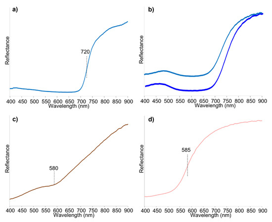 Reflectance spectra obtained by FORS analysis of P3 corresponding to (a) blue cotton; (b) blue silk; (c) brown silk textile; (d) pink silk textile.