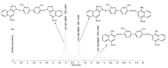 The HPLC analysis of the sample taken from the pink textile revealed the presence of three molecules, which were detected in the negative ionisation mode and produced doubly charged [M-2H]2− ions accompanied by weaker single charged [M-H]− ions (Figure 13). One of these molecules showed [M-2H]2− = m/z 339.0683 and [M-H]− = m/z 679.1439, which correspond to the chemical formula C34H28N6O6S2. The other two molecules showed [M-2H]2− = m/z 345.0683 and [M-H]− = m/z 691.1439, and [M-2H]2− = m/z 351.0683 and [M-H]− = m/z 703.1439, corresponding to C35H28N6O6S2 and C36H28N6O6S2, respectively. The result produced a match with a reference sample of benzopurpurin 4B (C.I. 23500) available from the book “A Manual of Dyeing: For the Use of Practical Dyers, Manufacturers, Students, and All Interested in the Art of Dyeing (Specimen of dyed fabrics)” [38] (Figure S5e—Supplementary Material). The smaller molecule is the one corresponding to the actual formula of benzopurpurin 4B, whereas the other two molecules appear to have one and two additional carbon atoms, respectively. These compounds have been recently elucidated by Chen et al. [23] as deriving from a reaction with formaldehyde followed by cyclization on one or both sides of the molecule. Our MS/MS data are in perfect agreement with the ones reported in the literature [23]. Benzopurpurin 4B is a disazo dye that was first synthesised in 1884 [52].