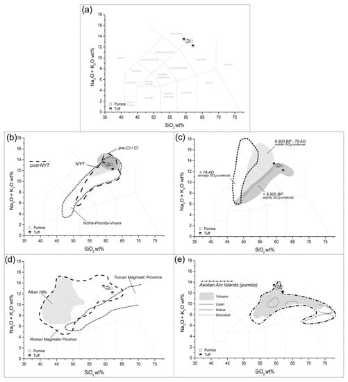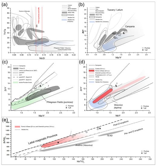 - Marra, F.; D’Ambrosio, E. Trace element classification diagrams of pyroclastic rocks from the volcanic districts of central Italy: The case study of the ancient Roman ships of Pisa. Archaeometry 2013, 55, 993–1019. [Google Scholar] [CrossRef]