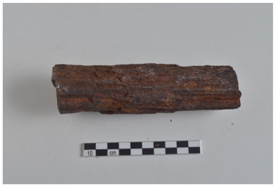 The massive concretions which completely cover the ferrous structures create a physical barrier between the object and the marine environment []). These concretions are responsible for the separation of anodic and cathodic reactions on the metal; the former is taking place on the metal’s surface and the latter inside the concretion layer. As a result of this, acidic conditions form at the metal’s surface due to hydrolysis of ferrous ions. The slag inclusions that wrought iron contains allow water to penetrate inside the metal due to electrochemical corrosion, resulting in a wood grain appearance and the loss of the original surface [].