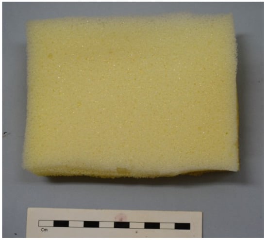 The porous medium was an industrial sponge made of polyurethane (Figure 2) (18′13′0.3 cm3 thick). It was tested for absorbency and resistance to 1 N sodium hydroxide (NaOH) solution in deionized water for at least 72 h, maintaining the pH of the alkaline solution above 13.