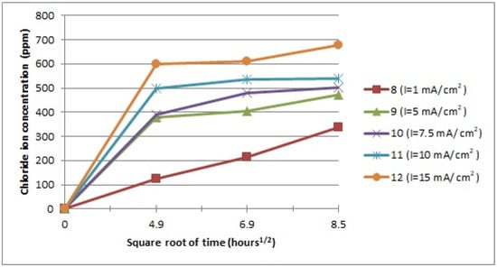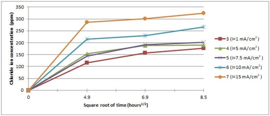 The theoretical concentrations of chloride ion diffusion [Cl−]th into the alkaline solution for the applied current densities are presented in Table 6.