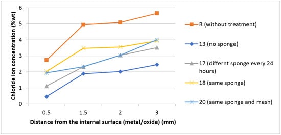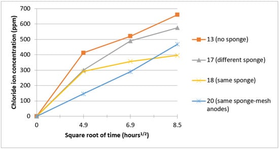 For all the experimental measurements of each specimen, the concentration of the chloride ion removal for 48 and 72 h treatments was added to the previous, except for the specimens 14, 15, and 16.