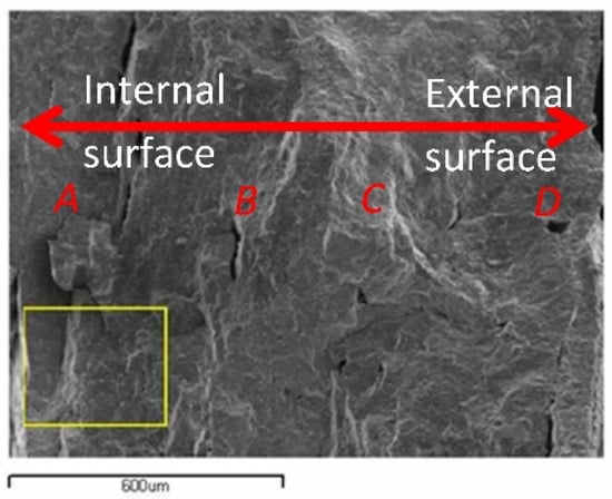 Firstly, a sample of the corrosion layer of specimen R (Figure 6) before and after its treatment with 5 N HNO3 solution was analyzed with a Scanning Electron Microscope. The concentration (% wt) of chloride ions before and after the treatment is seen in Table 8, where A = 0.5 mm, B = 1.5 mm, C = 2 mm, D = 3 mm are the distances between the points in the layer of the corrosion products from the internal surface (metal/oxide) to the external surface (oxide/environment).