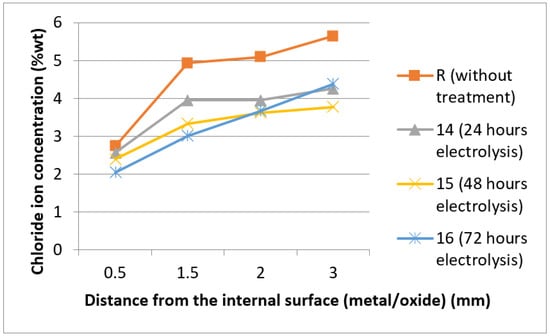 Three wrought iron specimens (14, 15, and 16) were treated with the same electrochemical procedure. Specimen 14 was wrapped with sponge and was treated for 24 h, with specimen 15 being treated for 48 h, and specimen 16 for 72 h. The whole procedure for each specimen was uninterrupted for the duration of the treatment. The applied impressed current was stable at 4 mA/cm2 and the average applied voltages of the SSE for the specimens were −860 mV, −850 mV, and −735 mV, respectively. The concentrations of the chloride ion removal for specimens 14, 15, and 16 are seen in Table 3 below.